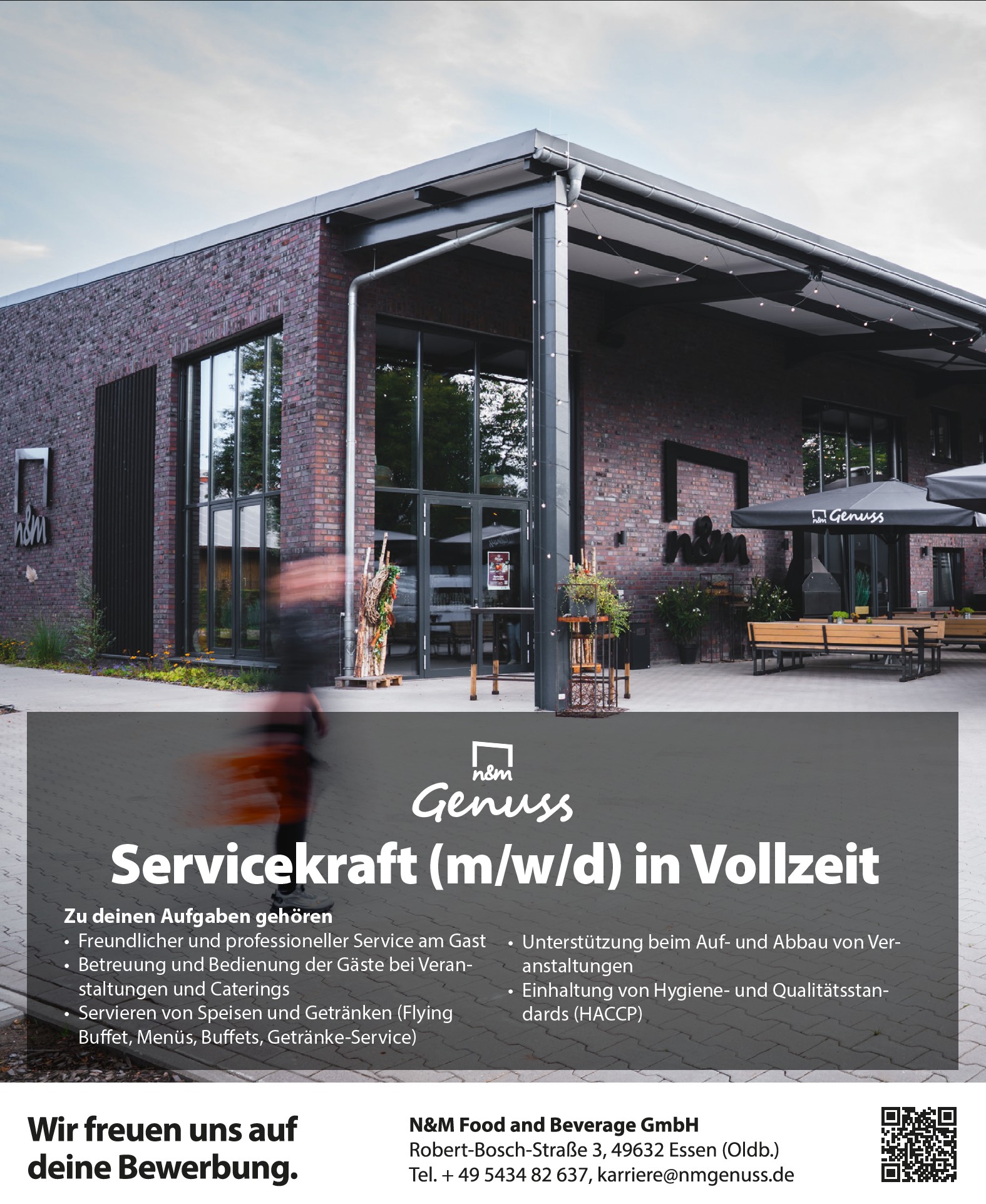 Persönlich. Erlebbar. Besser. Für das n&m Genuss Quartier in Essen (Oldb.) mit einer Eventlocation und angeschlossenem Catering-Service sowie einer gläsernen Brauerei suchen wir zur Verstärkung des Teams eine Servicekraft (m/w/d) in Vollzeit. Du hast Freude daran, Gäste mit einem Lächeln zu empfangen und ihnen unvergessliche Erlebnisse zu bereiten? Im n&m Genuss Quartier bist du mittendrin im Geschehen und sorgst mit deinem Service für eine echte Wohlfühlatmosphäre! Werde Teil unseres Teams und bringe dein Engagement und deine Gastgeberqualitäten mit ein!